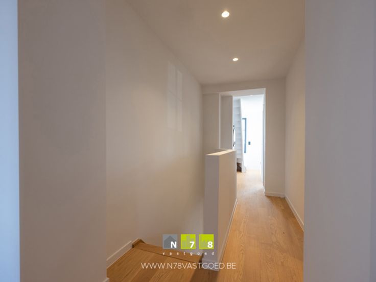 - Overloop ((3,66m x 1,74m) + (3,55m x 1,74m) = 6,37m²): aansluiting wasmachine en droogkast, parketvloer.