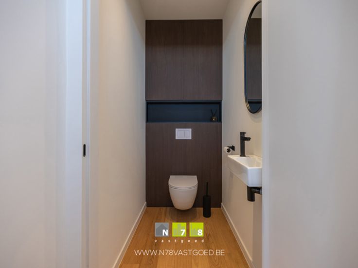 - Toilet (1,60m x 1,71m = 2,74m²): spoelbakje met kraan, inbouwkasten, parketvloer.