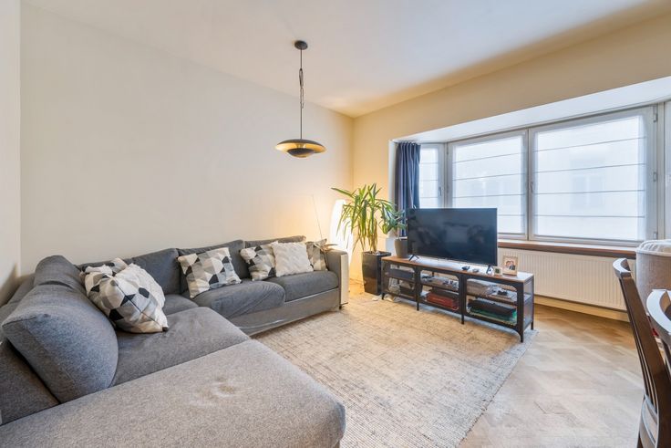 Bij binnenkomst via de inkomhal (9 m²)word je verwelkomd door de lichte en gezellige woonkamer (17m²) met originele parketvloer. De open, volledig uitgeruste keuken (11m²) maakt het plaatje hier compleet. Achteraan in het appartement vind je twee ruime slaapkamers (14m² en 13m²) en een recent vernieuwde badkamer (3m²) met een inloopdouche, toilet, wastafel en aansluitingen voor je was- en droogmachine.