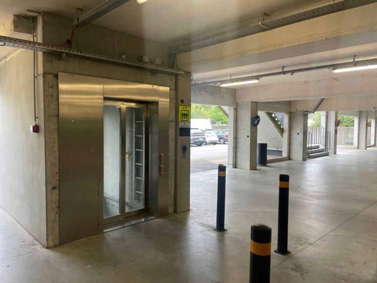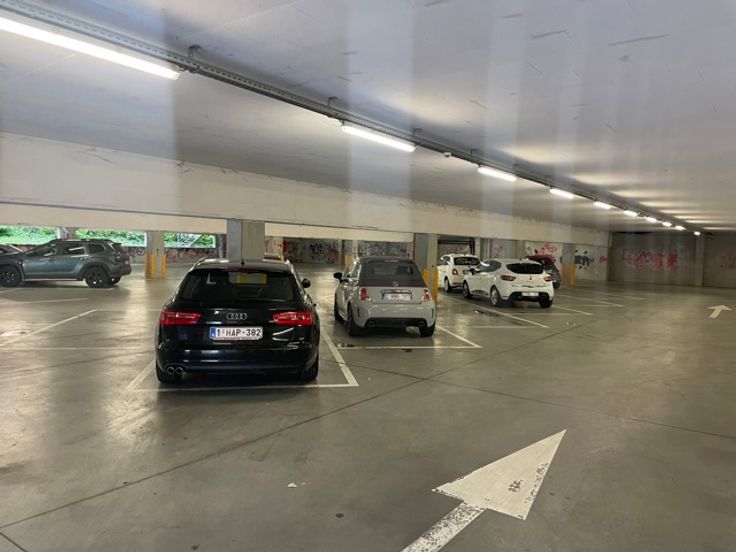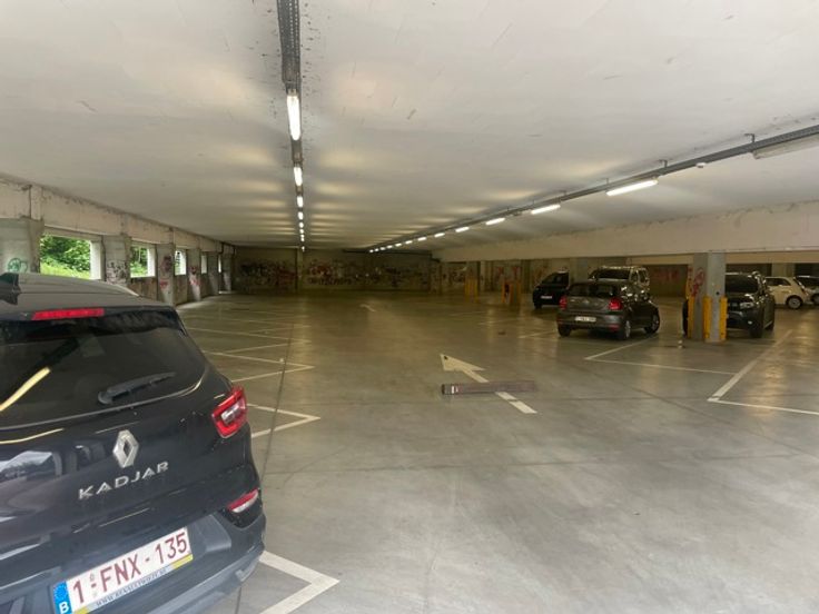 - Ruime overdekte parking op het gelijkvloers (60 plaatsen) onder de winkels, met lift en trappen.
