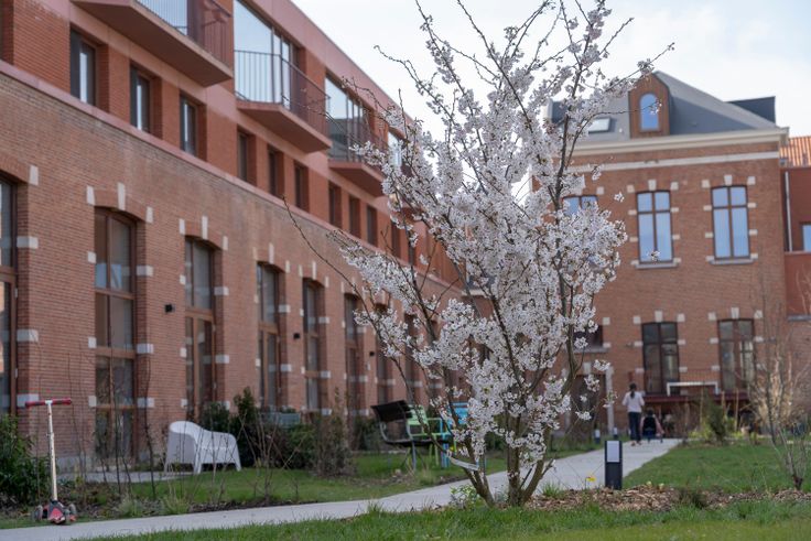 De voormalige speelplaats is omgetoverd tot een grote stadstuin, ideaal voor gezinnen met kinderen. De overdekte speelruimte en andere gedeelde voorzieningen, zoals een grote eetzaal met professionele keuken, crea-ruimte, living, coworking, 4 logeerkamers, wasruimte, bergingen, fietsenstallingen, en atelier, maken dit tot een bijzondere, comfortabele woonplaats in het hartje van de stad.