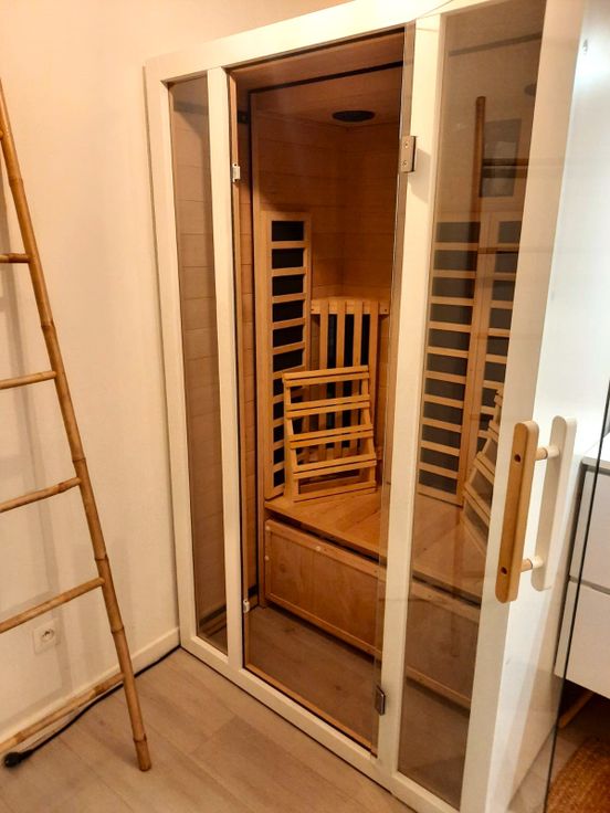 Het appartement van 142m² bevindt zich op de 1ste en 2de verdieping en beschikt over een grote, lichtrijke open leefruimte met keuken, eetruimte, living en bureau-hoek. Er is een ruime badkamer met toilet, bad, inloopdouche en infrarood sauna, een grote slaapkamer en 2 kinderkamers, en een extra toilet. Daarnaast zijn er twee private terrassen.