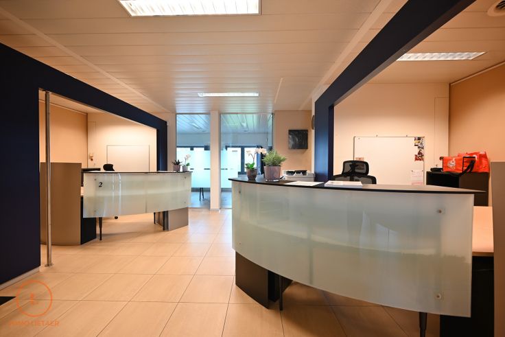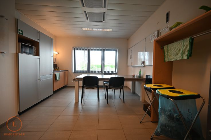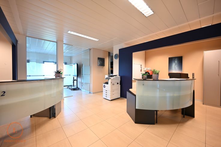inkomhal, open bureauruimte ingedeeld met 2 bureaus en onthaalruimte, afgesloten bureau, archiefruimte, keuken voorzien van gootsteen, frigo en afwasmachine, sanitaire ruimte met 2 toiletten. Voorzien van airco systeem en brandcentrale.