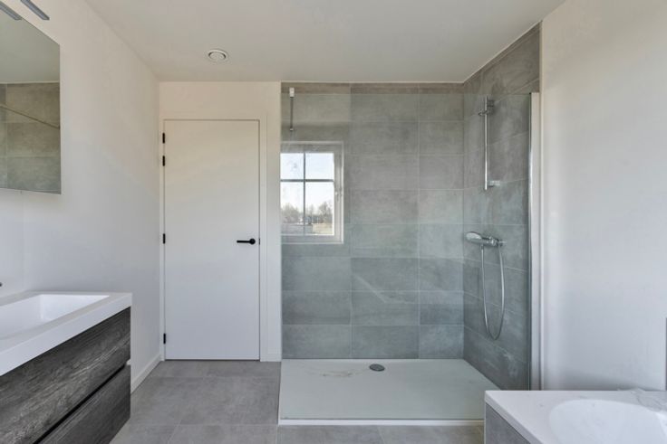 Badkamer met douche en bad.