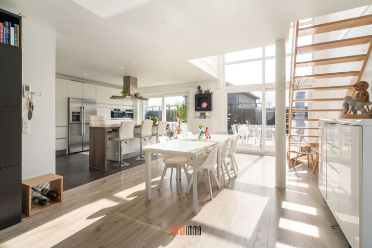 Gelijkvloers: inkomhal - toilet 1 - heerlijke leefruimte met vide en dubbelhoog raam als eyecatcher - zeer ruime half open leefkeuken (hoogwaardige toestellen) met het eiland als hart van de woning - berging- en wasplaats - zijdeur