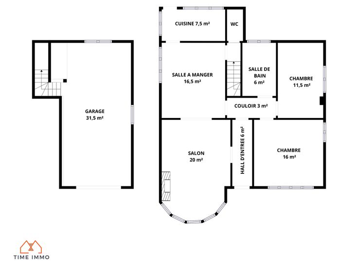Rez-de-chaussée : Un hall d'entrée donnant sur un salon, une salle à manger, une cuisine, 2 chambres, une salle de bain et un WC séparé.