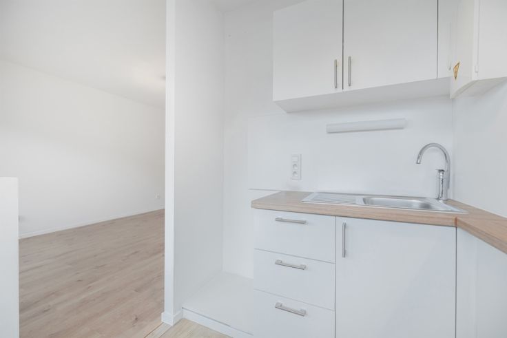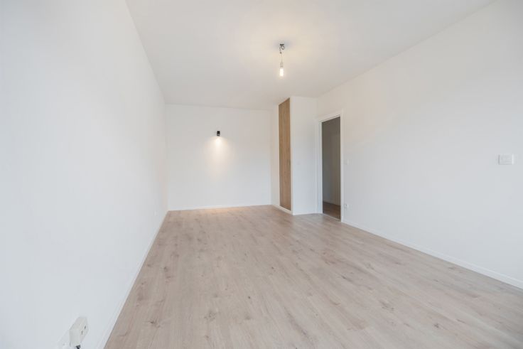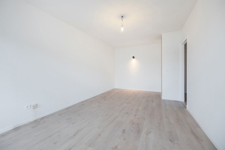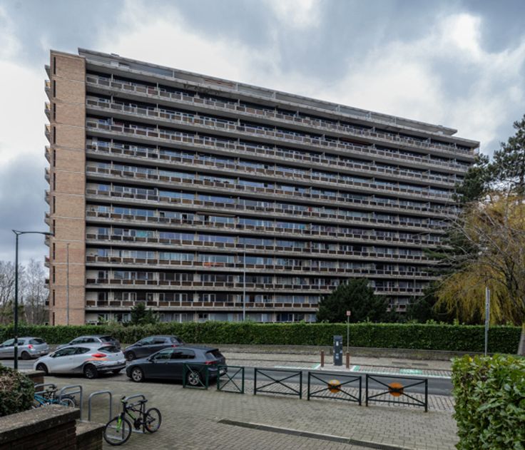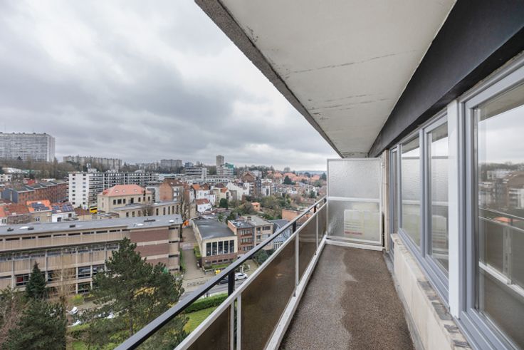 leefruimte met een open ingerichte keuken, een badkamer met toilet en een oostgericht terras. Daarnaast is er een kelder beschikbaar voor extra opslagruimte. Technieken : PVC-ramen met dubbele beglazing, individuele elektriciteitsmeter (€ 10/maand), watermeter via doorstroomteller, conforme elektriciteit - EPC B. De maandelijkse lasten bedragen € 160 en omvatten : gasverwarming, koud en warm water, gemeenschappelijke kosten (lift, verzekering, reservefonds). Parkeren : Parkeerplaatsen beschikbaar voor bewoners van het gebouw.