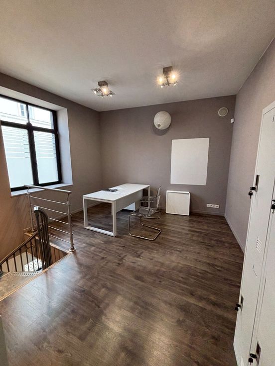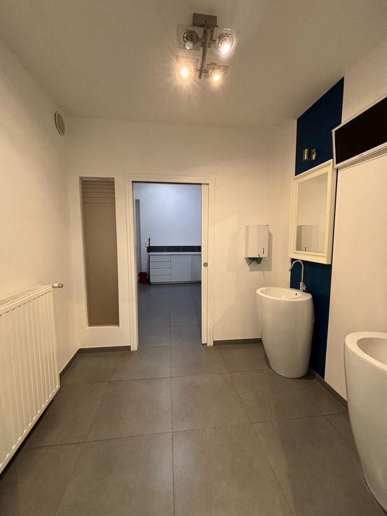 Situé dans la rue Joseph Hoyois, cet ancien cabinet d'orthodontie de 130 m² comprend : au RDC une vaste salle d'accueil de 30 m² (réception et salle d'attente), trois cabinets de travail, un laboratoire, sanitaires (Wc, lavabos), une salle de stockage ; à l'étage une kitchenette, un bureau administratif/ salle de réunion et un WC.