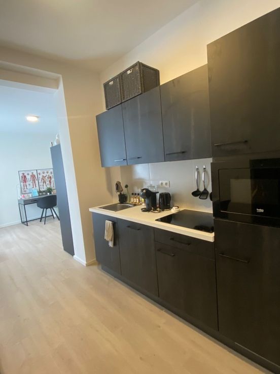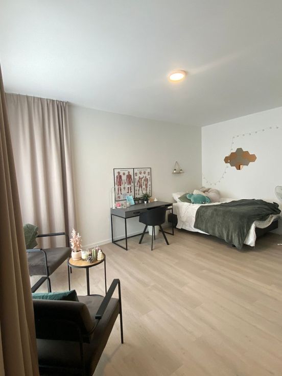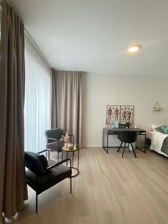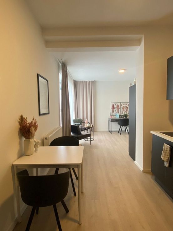 De studio is volledig bemeubeld en voorzien van alle nodige voorzieningen, waardoor het direct klaar is voor bewoning. De keuken is uitgerust met alle benodigde toestellen, zoals een koelkast en kookplaat, en er is voldoende kastruimte voor het opbergen van boodschappen.