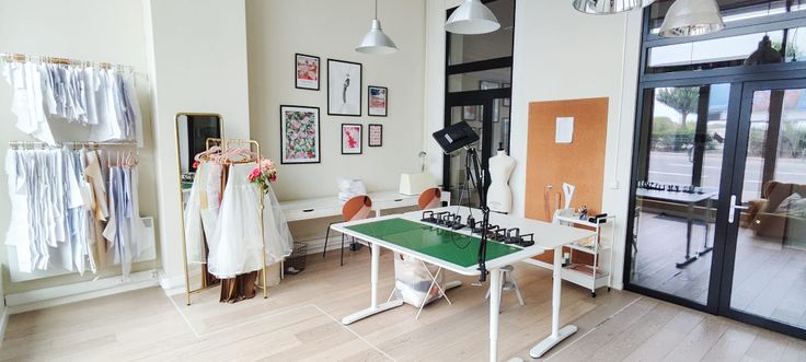 L'espace est divisé en deux parties par des portes vitrées : un partie avant servant actuellement d'atelier couture, une partie arrière avec WC, kitchenette, espace de stockage ainsi qu'une grande mezzanine de stockage, servant actuellement de bureau et de studio photo.