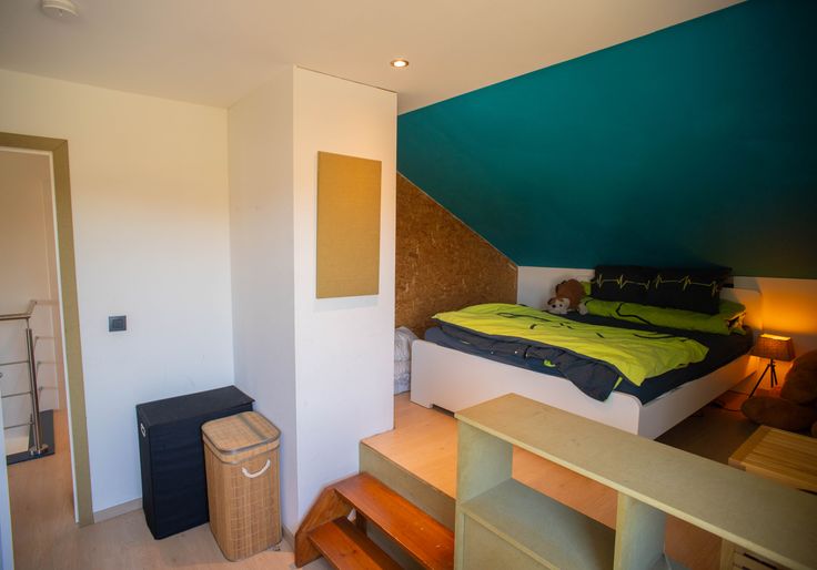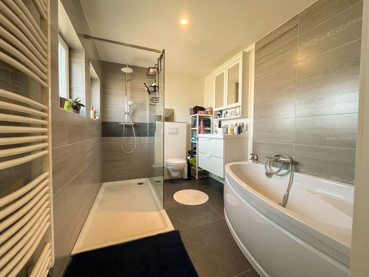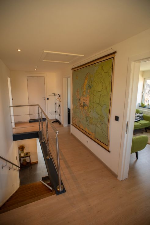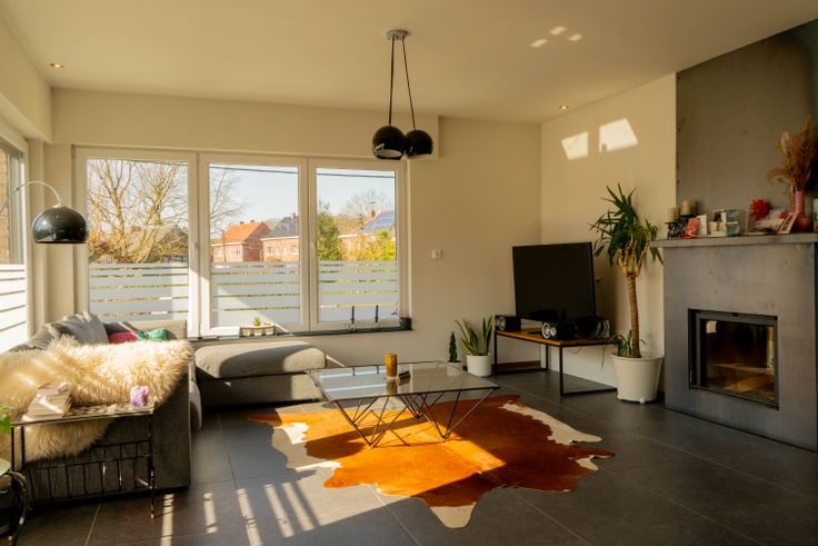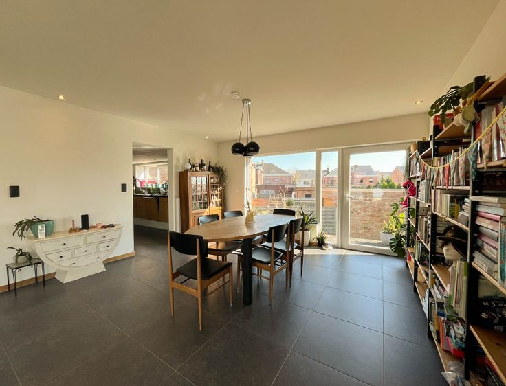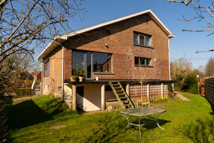 Vlakbij invalswegen en op fietsafstand van Gent. Deze is ontworpen in halve verdiepingen, wat een gevoel van ruimte en gezelligheid creëert. Op de begane grond vinden we de inkomhal met ingemaakte kast voor jassen, het gastentoilet en bureauruimte. Een half verdiep hoger bevinden zich dan de keuken en living met toegang tot het terras in de tuin. In de living is een dubbele openhaard (naar bureau). Boven zijn er drie slaapkamers, een opbergruimte en een badkamer met bad, douche, toilet en wastafel
