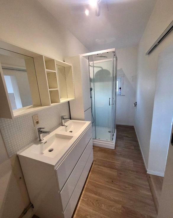 Indeling : inkomhall - eetkamer 12m² - woonkamer 15m² - keuken 17m² -keuken 17m² - 2 slaapkamers (12/12m²) - badkamer (dubbele lavabo + douche + wc) 6m².