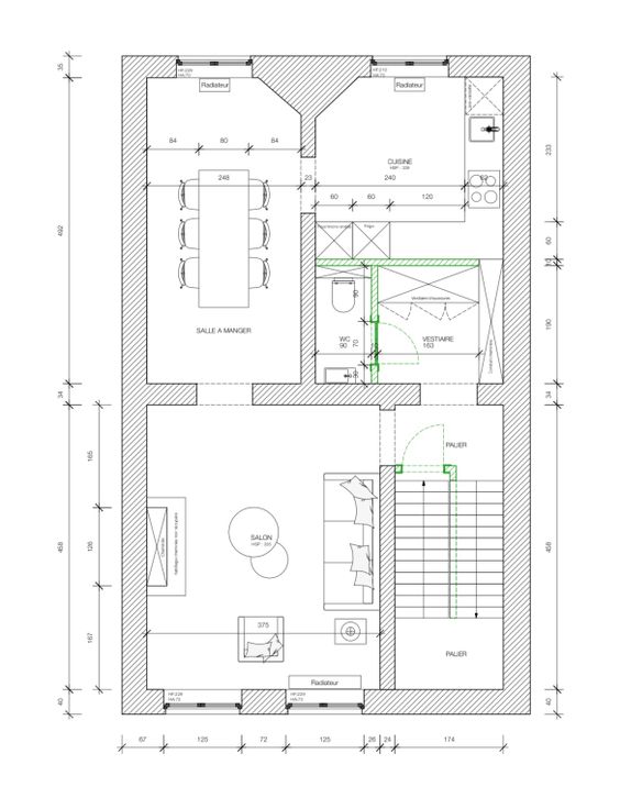 Op de eerste verdieping vind je een ruime woonruimte die aansluit op een moderne, volledig uitgeruste keuken met eetruimte. Daarnaast is er een apart toilet en een vestiaire.