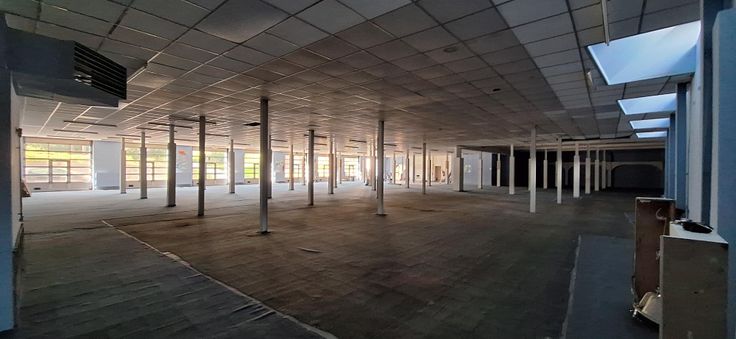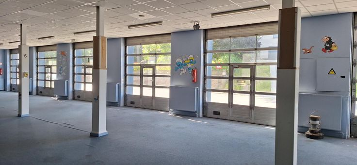 ruimte van 1.075m², 8 sectionaalpoorten aan straatkant, sanitaire voorzieningen, parking. Basis KI 3.392, OV ten laste van huurder.
