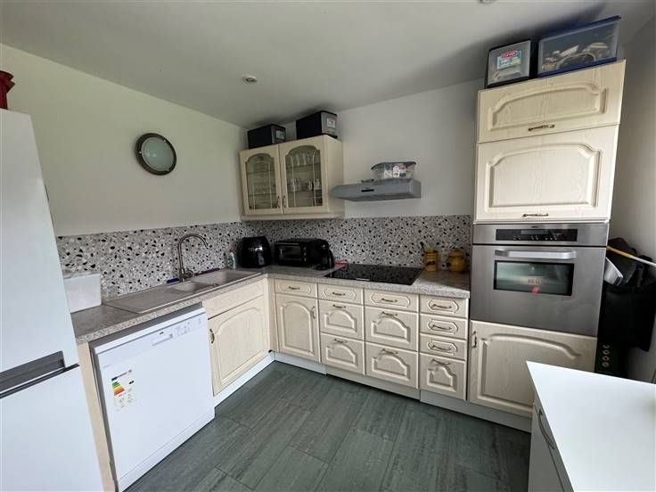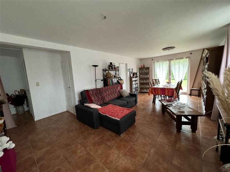 Au rez, hall, WC, living, cuis équip, SDB, Chambre, terrasse et accès jardin commun, cave.