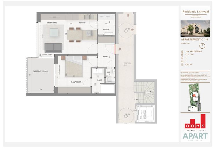 Dit appartement heeft een oppervlakte van 57,11m² met een overdekt terras van 8,95m² en is gelegen op de eerste verdieping van Blok C dat zich achteraan het binnenplein bevindt. Het appartement telt 1 slaapkamer, 1 badkamer, een ruime leefruimte met open keuken en een berging.