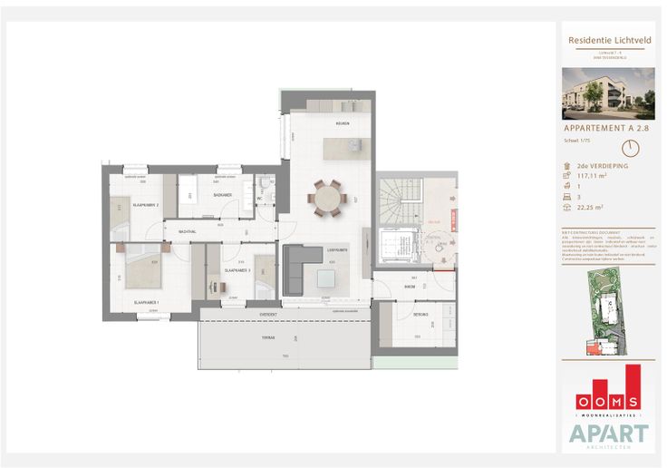 Appartement A2.8 is één van de 22 BEN-appartementen van nieuwbouwproject Lichtveld in Tessenderlo. Dit appartement is gelegen op wandelafstand van het centrum. In vogelvlucht zo'n 500 meter. Het is voorzien van alle modern wooncomfort, een luxueuze afwerking en energiezuinige technieken. Denk daarbij aan vloerverwarming en -koeling met warmtepomp, ventilatiesysteem D, (gemeenschappelijke) zonnepanelen, zonnewering (screens), uitgebreide intelligente elektrische installatie, toegangscontrole, ... Dit appartement heeft een oppervlakte van 117,11m² met een overdekt terras van 22,25m² en is gelegen op de tweede verdieping van Blok A dat zich tegen de straatzijde bevindt. Het appartement telt 3 slaapkamers, 1 badkamer, een ruime leefruimte met open keuken en een berging.   Renovatieplicht: onbekend