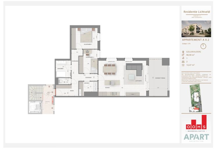 Dit appartement heeft een oppervlakte van 98,90m² met een overdekt terras van 14,47m² en is gelegen op het gelijkvloers van Blok A dat zich tegen de straatzijde bevindt. Het appartement telt 2 slaapkamers, 1 badkamer, een ruime leefruimte met open keuken en een berging.