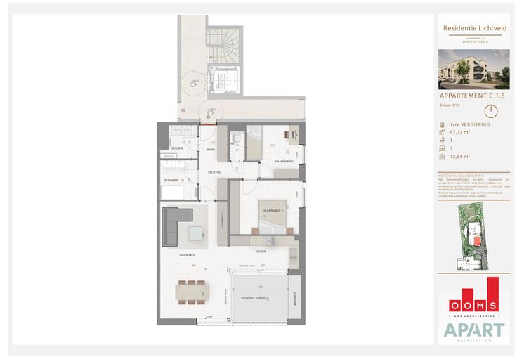 Appartement C1.8 is één van de 22 BEN-appartementen van nieuwbouwproject Lichtveld in Tessenderlo. Dit appartement is gelegen op wandelafstand van het centrum. In vogelvlucht zo'n 500 meter. Het is voorzien van alle modern wooncomfort, een luxueuze afwerking en energiezuinige technieken. Denk daarbij aan vloerverwarming en -koeling met warmtepomp, ventilatiesysteem D, (gemeenschappelijke) zonnepanelen, zonnewering (screens), uitgebreide intelligente elektrische installatie, toegangscontrole, ... Dit appartement heeft een oppervlakte van 97,22m² met een overdekt terras van 12,64m² en is gelegen op de eerste verdieping van Blok C dat zich achteraan het binnenplein bevindt. Het appartement telt 2 slaapkamers, 1 badkamer, een ruime leefruimte met open keuken en een berging. Het volledige interieur (keuken, badkamer, kastwerk, ...) kan door de koper nog volledig samengesteld worden. Daarvoor kan de koper beroep doen op de interieurarchitecten van Ooms Woonrealisaties. Zij zorgen voor een ontwerp (incl. uitvoering) op maat. Renovatieplicht: onbekend