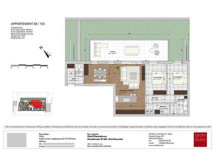 Aantrekkelijke nieuwbouwresidentie bestaande uit 11 energiezuinige doorzonappartementen (BEN) telkens uitgetekend met een individueel en functioneel vloerplan & voorzien van aangename tuintjes en terrassen. De appartementen variëren qua woonoppervlakte tussen de 90m² en 131m² voor wat betreft de 2 slaapkamer appartementen. Tevens is er op de bovenverdieping een pronkstuk voorzien onder de vorm van een 3 slaapkamer penthouse van maarliefst 151m². De hedendaagse architectuur met functionele vloerplannen, het zorgvuldig uitgewerkte inplantingsplan met veel groen en de topscore qua energiezuinigheid met o.a. warmtepomp o.b.v. diepteboring zijn slechts enkele van de vele troeven die dit project te bieden heeft. INDELING APPARTEMENT 103 (99m²): 1e verdieping: Inkomhal met ruimte voor vestiaire; Woonkamer met open keuken en zicht op/toegang tot het comfortabele terras (33m²); 2 slaapkamers; Badkamer; Berging; Carport met aansluitende privé berging (+ € 17.500). EXTRA INFO: Mogelijkheid tot aankoop aan 6% BTW voor werken in 2024, informeer naar de voorwaarden; Maximum E peil 20 (BEN norm); Hedendaags project met mooi inplantings & omgevingsplan; Lichte & aangename woonruimten door de mooie glaspartijen; Vloerverwarming via warmtepomp op basis van diepteboring; Lift aanwezig in het gebouw; Centraal gelegen op de N403 op een vlot bereikbare locatie; Uitstekende uitvalsbasis voor zowel Antwerpen als Gent maar ook voor Sint-Niklaas & Hulst met de nabijheid van zowel E34