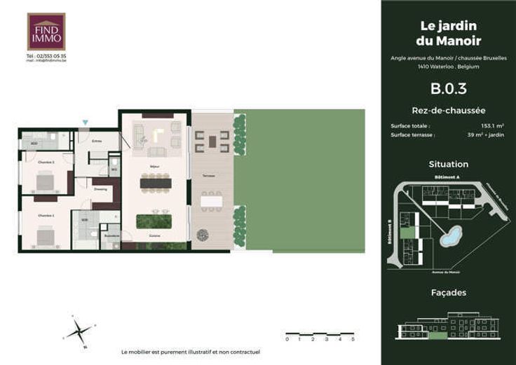 www.lejardindumanoir.be Waterloo - Quartier du Manoir - dans un nouveau projet immobilier de prestige : Appartement de 153m2 au rez-de-chaussée avec terrasse de +/-40m2 + jardin privatif de 200m2. le logement se compose d'un hall d'entrée avec espace vestiaire et toilette invité, spacieux séjour ouvert sur une magnifique cuisine, buanderie, deux suites avec dressing et salle de bains ou salle de douche. Cet ensemble résidentiel offre un cadre de vie exceptionnel, alliant confort, sécurité, modernité et sérénité. Chaque appartement spacieux pensé pour offrir un bien-être optimal, dispose d'une grande terrasse et d'un jardin privatif pour les rez-de-chaussée, idéal pour profiter des beaux jours. Les résidents pourront se promener autour d'un étang pittoresque et bénéficier de chemins aménagés pour des balades. Avec des finitions luxueuses et des prestations de qualité, ce projet pourra répondre aux attentes des plus exigeants. Situé dans un quartier résidentiel calme et réputé pour son cadre de vie agréable, il allie à la perfection tranquillité et proximité des commodités. Ne manquez pas l'opportunité de vivre dans cet écrin de verdure, où chaque détail a été pensé pour vous offrir un quotidien des plus agréable. Air conditionné, chauffage au sol, triple vitrage, porte blindée, finitions haut de gamme au choix, .... Chaque appartement disposera d'un box deux voitures et d'une cave en sous-sol. N'hésitez pas à nous contacter afin de discuter de ce projet unique