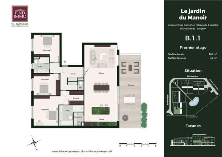 www.lejardindumanoir.be Waterloo - Quartier du Manoir - dans un nouveau projet immobilier de prestige : Appartement de 180m2 au 1er étage avec terrasse de +/-45m2. le logement se compose d'un hall d'entrée avec espace vestiaire et toilette invité, spacieux séjour ouvert sur une magnifique cuisine, buanderie, une suite avec dressing et salle de bains, deux grandes chambres avec salle de bains. Cet ensemble résidentiel offre un cadre de vie exceptionnel, alliant confort, sécurité, modernité et sérénité. Chaque appartement spacieux pensé pour offrir un bien-être optimal, dispose d'une grande terrasse et d'un jardin privatif pour les rez-de-chaussée, idéal pour profiter des beaux jours. Les résidents pourront se promener autour d'un étang pittoresque et bénéficier de chemins aménagés pour des balades. Avec des finitions luxueuses et des prestations de qualité, ce projet pourra répondre aux attentes des plus exigeants. Situé dans un quartier résidentiel calme et réputé pour son cadre de vie agréable, il allie à la perfection tranquillité et proximité des commodités. Ne manquez pas l'opportunité de vivre dans cet écrin de verdure, où chaque détail a été pensé pour vous offrir un quotidien des plus agréable. Air conditionné, chauffage au sol, triple vitrage, porte blindée, finitions haut de gamme au choix, .... Chaque appartement disposera d'un box deux voitures et d'une cave en sous-sol. N'hésitez pas à nous contacter afin de discuter de ce projet unique. FINDIMMO 02