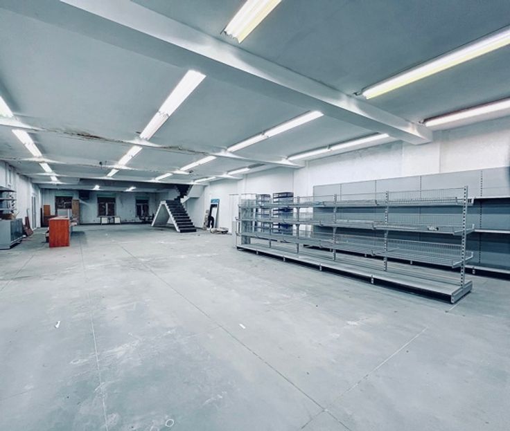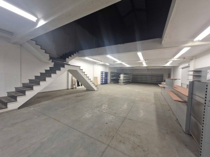 Het magazijn heeft een totale oppervlakte van ongeveer 900 m² verdeeld over twee verdiepingen, met een begane grond van ongeveer 460 m² en een bovenverdieping van ongeveer 300 m². Er is ook een sanitaire ruimte met een dubbele wc en een watertappunt. De toegang is via een deur van 3,30 m hoog en 3,30 m breed. Er is een verwarmingssysteem op gas geïnstalleerd voor dit deel van het gebouw. Er is ook een te renoveren woning, verdeeld over twee verdiepingen van elk 30 m², met twee kamers per verdieping. Er is ook een kelder voor de meters. Dit deel kan naar wens worden verbouwd tot kantoorruimte.