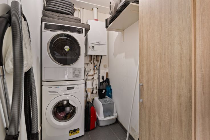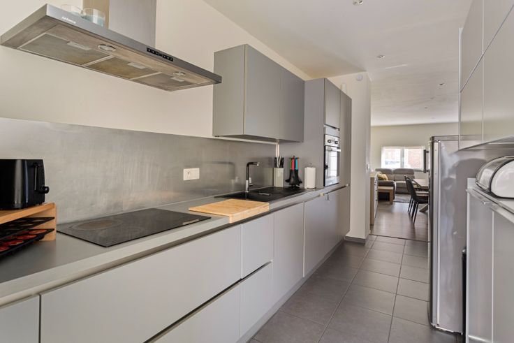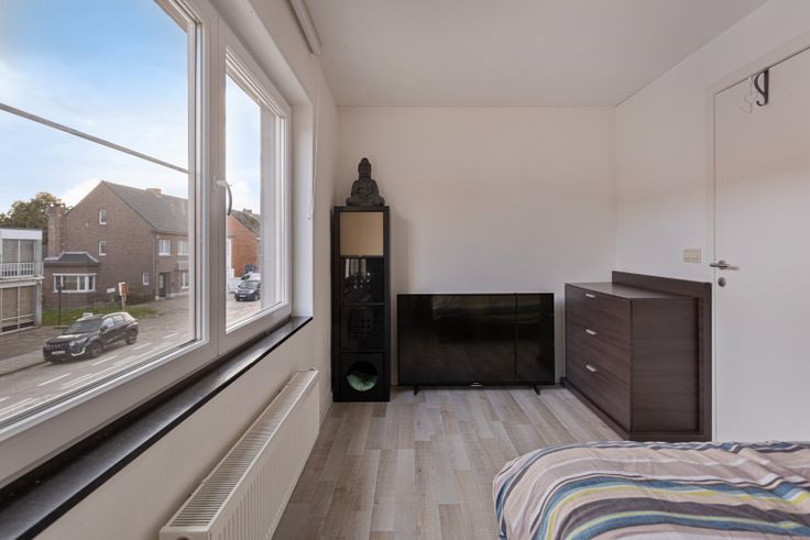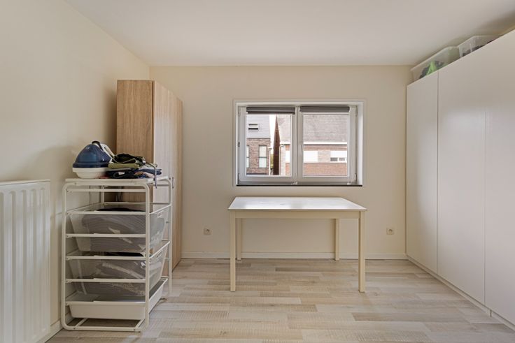 De woonkamer is ingedeeld in een gezellige zithoek en eethoek. Dankzij de grote ramen vooraan de woning genieten we van aangenaam veel lichtinval. De moderne keuken bevindt zich aansluitend aan de leefruimte en is uitgerust met elektrische kookplaat, afzuigkap, koelkast, heteluchtoven en vaatwasser. Als we verder lopen komen we in de aanbouw waar zich nog ruimte bevindt voor een eettafel, leeshoek of werkruimte. De berging bevindt zich vlak naast de keuken en biedt tevens aansluiting voor een wasmachine.