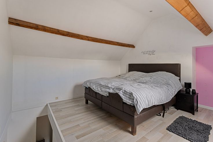 Op de verdieping is de woning voorzien van twee mooie slaapkamers, een volledig uitgeruste en vernieuwde badkamer en extra dressing. Via vaste trap bereiken we de zolderkamer welke momenteel ingericht is als derde zeer ruime slaapkamer.