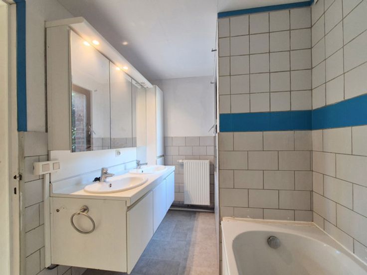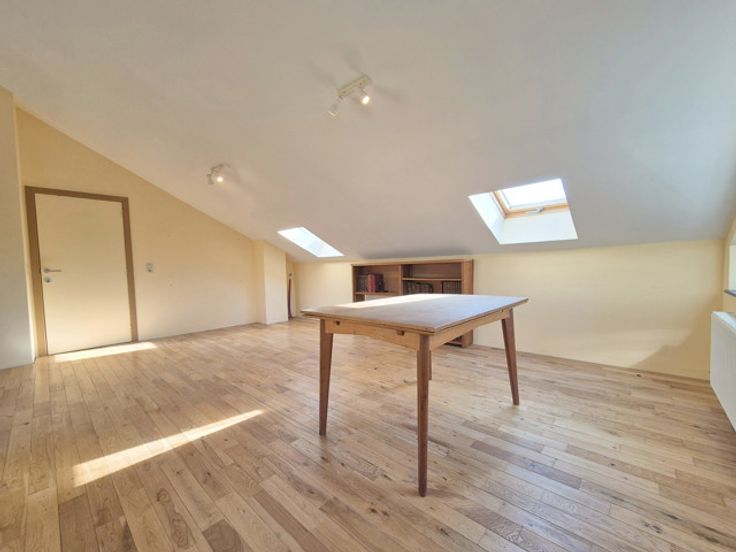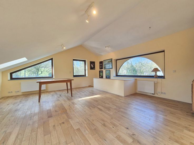 À l’étage, vous trouverez une grande chambre (+/-32 m²) qui peut être aménagée comme second salon/chambre/bureau.