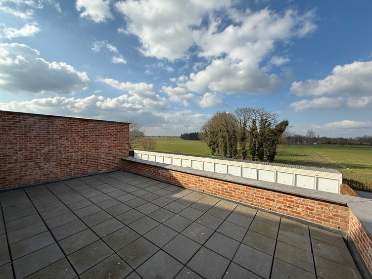 Woonkamer met open keuken,voorzien van de nodige toestellen.Badkamer met douche en dubbele wastafel,toilet, bergruimte, 2 slaapkamers, garage, autostaanplaats en groot terras.