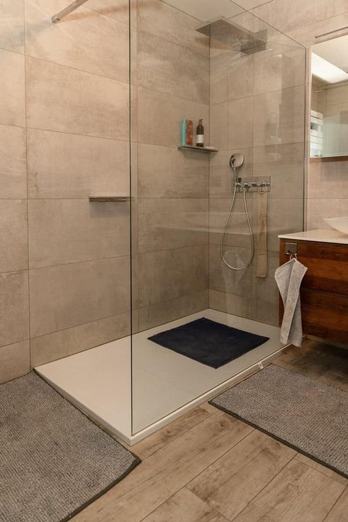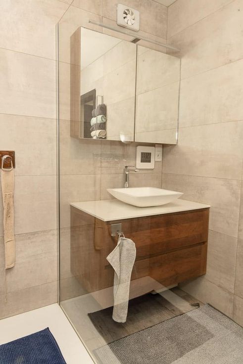 De gerenoveerde badkamer is voorzien van een inloopdouche en modern lavabomeubel.
