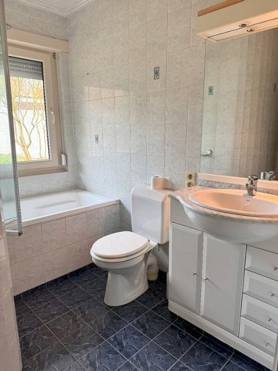 Deze mooi gelegen en ruime woning beschikt op het gelijkvloers over een inkomhal met vestiaire, een ruime en lichtrijke woonkamer, een keuken met aangrenzende bergruimte en een grote slaapkamer (14m²) met badkamer.