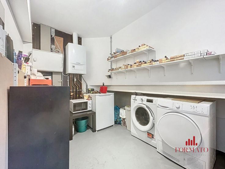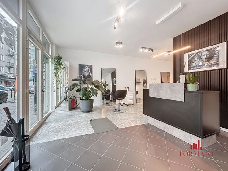 Met zijn geoptimaliseerde U-vormige indeling en een grote glazen etalage van 7 meter lang, biedt het salon maximale zichtbaarheid. Het bestaande meubilair is inbegrepen en het pand beschikt over een achtergedeelte met toilet en kleine keuken, evenals een privébuitenruimte van 20 m². De ruime kelder, bestaande uit drie aaneengeschakelde kamers van ongeveer 46 m², biedt waardevolle opslagruimte. Individuele meters voor water, gas en elektriciteit zorgen voor onafhankelijk nutsbeheer.