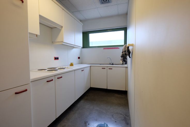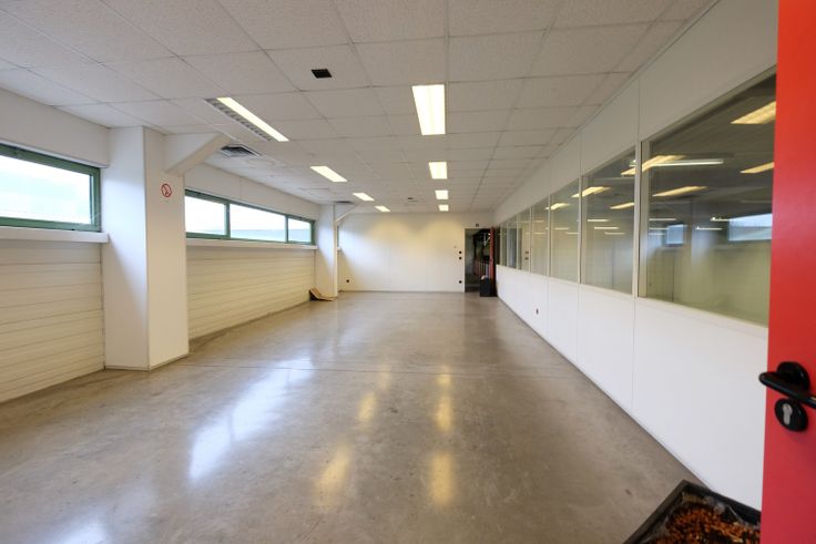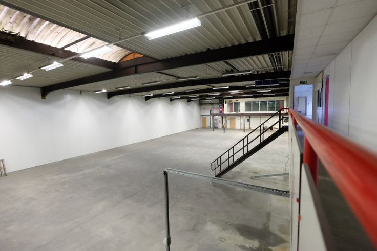 De nieuwe huurder kan gebruik maken van 584 m² bedrijfsruimte + 240 m² op verdieping, bestaande uit douches, bureelruimtes, kleedkamers, etc. . .
