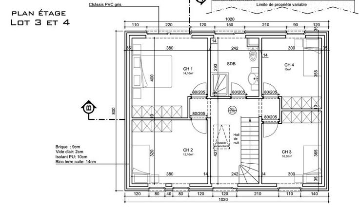 Étage 1 : Hall de nuit , chambre 1 (14,1 m2), chambre 2 (12,1 m2), chambre 3 (10,3 m2), chambre 4 (10 m2), salle de bain avec wc (7,1 m2).