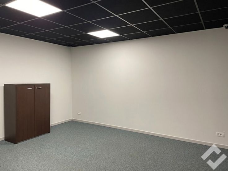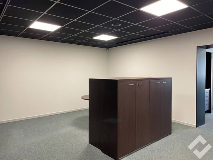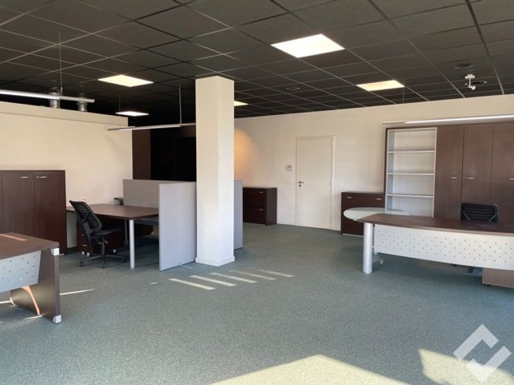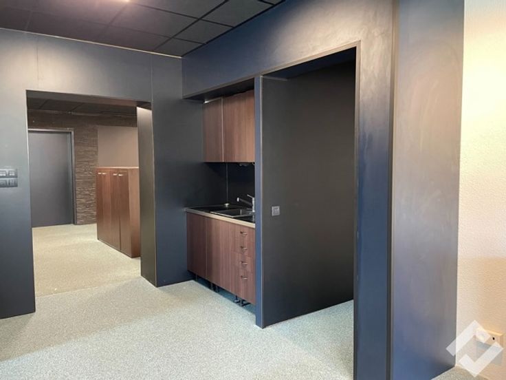 Vooraan kan men de zeer energiezuinige kantoren terug vinden, deze betrekken 108m2 van de bruikbare oppervlakte. Achteraan in de kantoren is er nog een deel doorgetrokken in de hal, dit is eventueel ook nog bruikbaar als verwarmd atelier. De kantoren hebben alle voorzieningen zoals internet, telefoon, sanitair (M/V), kitchenette en ventilatiesysteem D. De open indeling geeft het geheel een landscape gevoel.