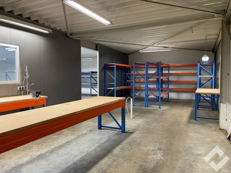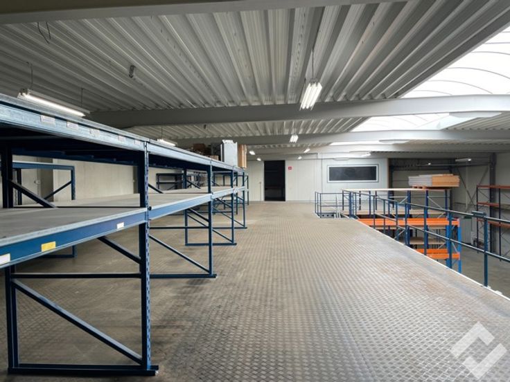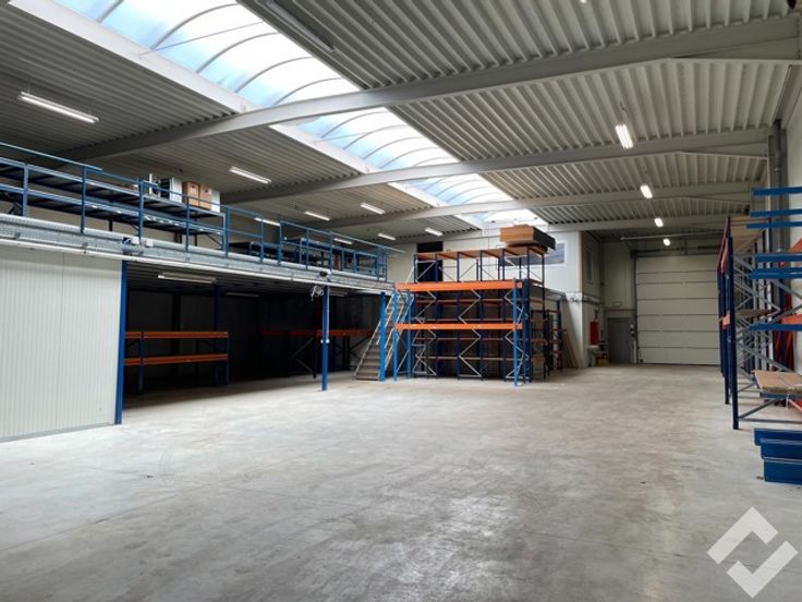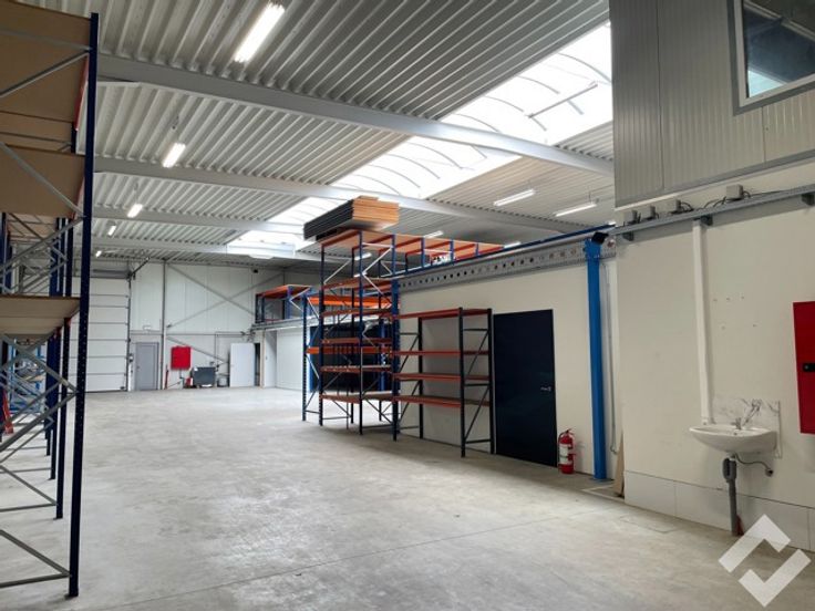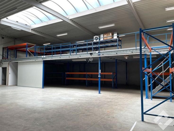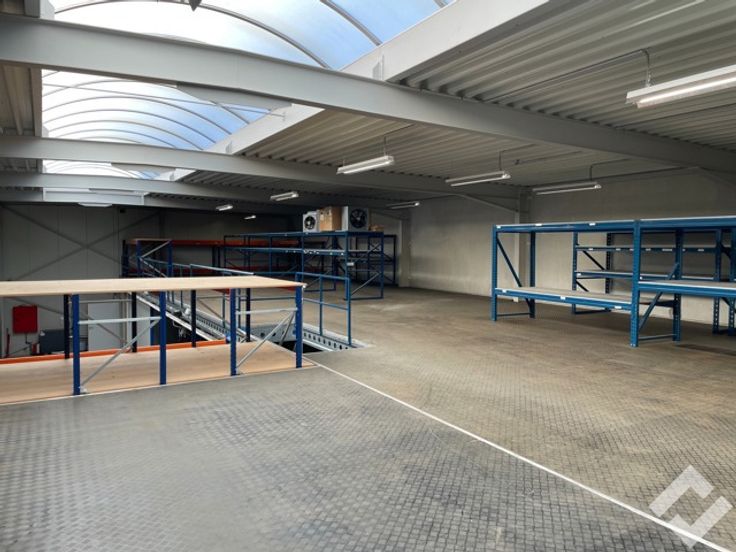 Via een automatische sectionaalpoort of sas kan je de werk/opslagplaats bereiken met bruikbare oppervlakte van 567m2, vrije hoogte van de hal ca. 7,5m. Voorzieningen zoals stroompunten 220V/380V, twee automatische sectionaalpoorten, water, edm. zijn aanwezig! Momenteel staat er een tussenverdieping in die met een vaste trap toegang geeft tot een kleine opslagruimte. In het dak is een lichtstraat ingewerkt en op het dak liggen zonnepanelen!