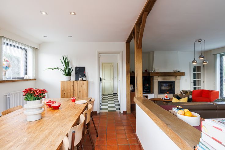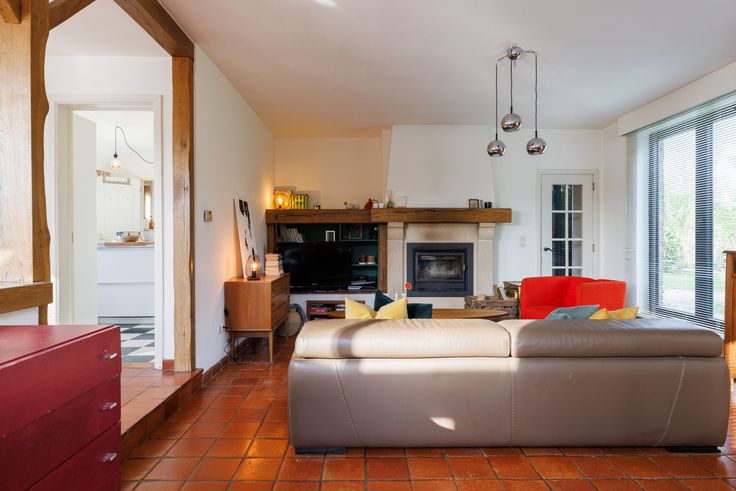 Inkomhal met vestiaire en ingebouwde kast, gastentoilet, badkamer met bad en dubbel lavabomeubel, inpandige garage en berging met mazoutbrander en aansluiting voor wasmachine, lichtrijke leefruimte (met haardcassette) met optrede naar eethoek en directe toegang tot ingerichte keuken met directe toegang tot de tuin met 2de garage en stapelplaats voor brandhout.