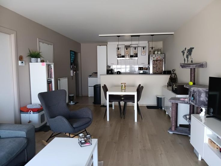 Het app is op de 3e verdieping, te bereiken met een lift en trap en bestaat uit een ruime zonnige woonkamer (opp ca 35m²) met open ingerichte keuken.