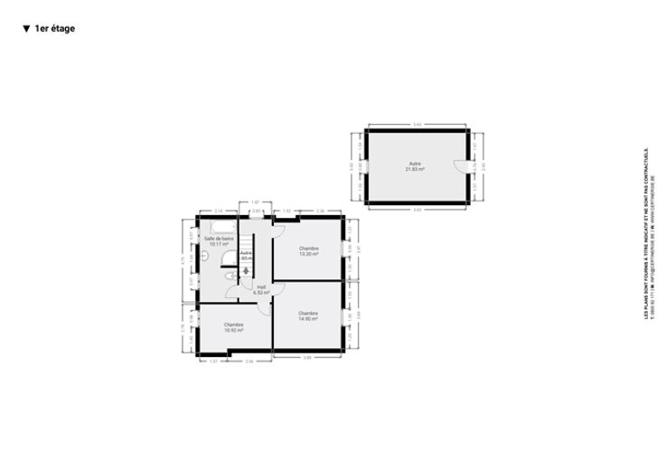 1e: hal, 3 slaapkamers van 11, 13 en 15m² en badkamer van 10m².