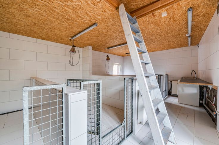 Begane grond: inkomhal + WC, ruime woonkamer van 45m², ingerichte keuken van 17m² met bijkeuken, bijkeuken en toegang tot een 1e atelier van 24m².