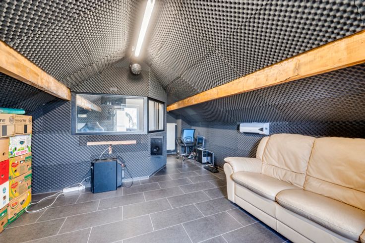 Het pand heeft ook een akoestisch geïsoleerde ruimte (radiostudio) van 22m² met onafhankelijke toegang, ideaal als kantoor.