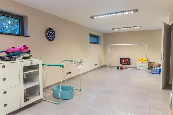 De indeling is als volgt: Inkomhal met toilet (tegelvloer) - woonkamer 42,7 m² (tegelvloer) - volledig ingerichte keuken met ontbijthoek 11,8 m² (tegelvloer): koelkast, diepvriezer, vaatwasmachine, microgolfoven, oven, inductie kookvuur - bureau / fitnessruimte 38 m² (tegelvloer) - 5 slaapkamers (parket): 16 m² / 20,5 m² / 13,3 m² / 2 x 13,7 m² - badkamer met bad, douchecabine en 2 lavabo's in meubel - douchekamer met douchecabine en 1 lavabo in meubel (ensuite slaapkamers 1 en 2) - berging 7,8 m² (tegelvloer) - wasruimte 6 m² (tegelvloer) - tuin (omheind) met terras 18 m².