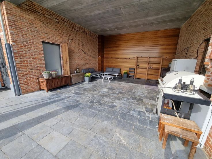 Absolute troef is de grote en zeer hoge garage van 58m², ideaal voor mensen die houden van veel berging of die nood hebben aan een praktische werkruimte. Achteraan de garage is een hoge automatische toegangspoort die bereikbaar is via achterliggende wegenis.