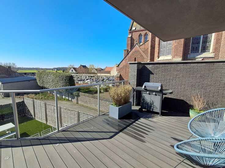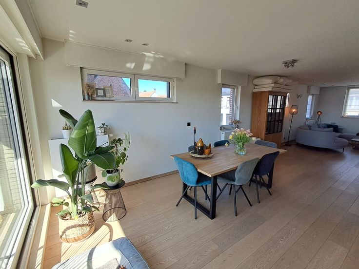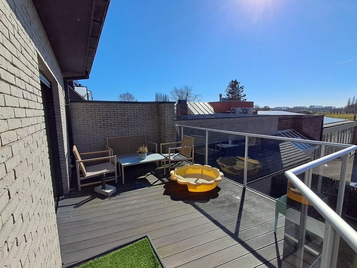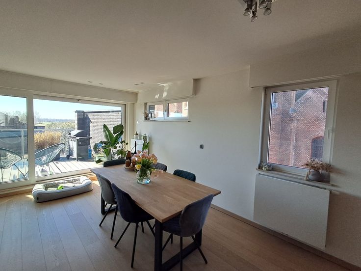 Zeer ruim en lichtrijk appartement in het centrum van Sijsele, vlakbij de Kerk. Dit hoekappartement op de eerste verdieping is zeer luxueus afgewerkt en beschikt over alle comfort! Ze is als volgt ingedeeld: inkom met gastentoilet, leefruimte bestaande uit zitgedeelte met ingemaakte wand met gascassette, eetplaats met moderne keuken voorzien van alle toestellen (oven, microgolf, stoomoven, espressomachine, vaatwas, elektrische kookplaat, dampkap en koelkast), 2 slaapkamers, badkamer met ligbad, ruime inloopdouche en dubbele lavabo in meubel. Aan de leefruimte en de slaapkamer achteraan is er een ruim zonneterras, perfect gericht naar het Zuiden! Geruisloze lift aanwezig in het gebouw. Alles is afgewerkt met kwalitatieve materialen: Miele-toestellen in de keuken, parket in de leefruimte en de slaapkamers, inbouwspots, elektrische rolluiken aan de achterzijde en de zijkant van het appartement, muggenramen aanwezig, ledverlichting rond het terras, .... Het appartement is volledig geschilderd en is dus instapklaar. Vrij: 1 juni 2025. Huurprijs: 860,00 euro per maand (syndickosten inbegrepen). Mogelijkheid tot het huren van de garage (85,00 euro per maand.)