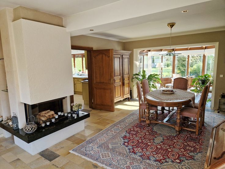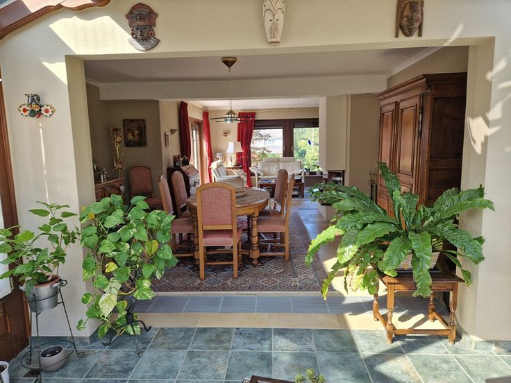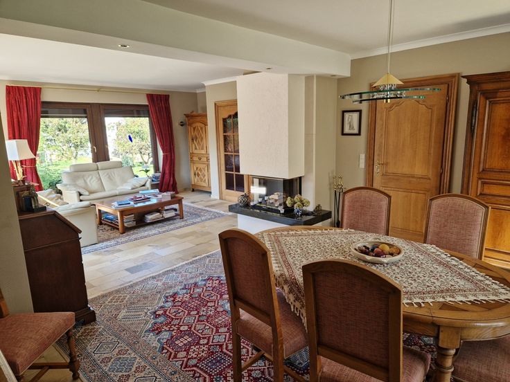 Accédez à cette prestigieuse demeure par les majestueux escaliers en pierres. Pénétrez ensuite dans l’éclatant hall d’entrée avec wc et vestiaire qui dessert un spacieux séjour agrémenté d’un élégant foyer à bois. Cet espace de vie est une magnifique salle de réception portant à la convivialité ouverte sur une terrasse orientée plein sud et sur une élégante verrière bénéficiant d’une vue pleinement dégagée sur un somptueux écrin de verdure et donnant accès à une terrasse. Le rez dispose également d’une cuisine équipée élégamment agencée avec coin repas.