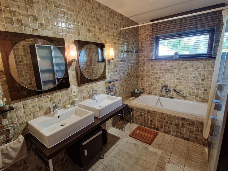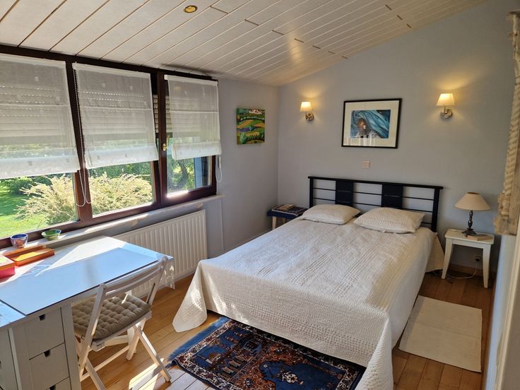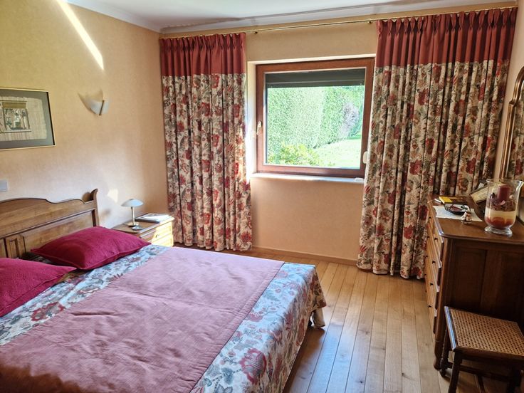 De plain-pied, un espace nuit comprenant deux chambres dont une est affectée actuellement en bureau, une salle de bain (baignoire et meuble lavabo double vasque) et un wc individuel.