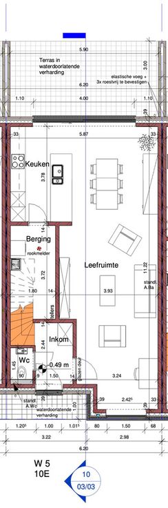 * Gelijkvloers: inkomhal met bezoekerstoilet, ruime leefruimte met schuifraam naar het terras, open geïnstalleerde keuken, berging/wasplaats.