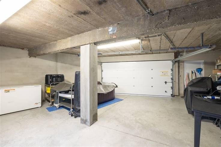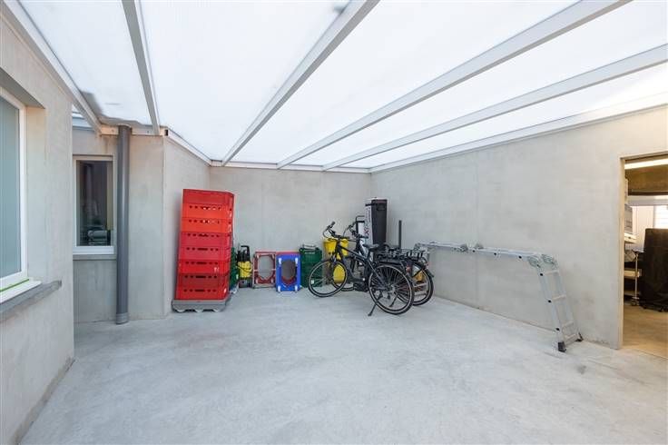 Achterliggend is er een overdekte koer van 35 m². Vervolgens vinden we de ruime garage (53 m²) geschikt voor 2 wagens en bijkomende opslag. Er is een grote sectionaalpoort voorzien. Er is een oprit van 62 m² die uitgeeft op een achterliggende straat. Zeer handig voor leveringen en als extra parkings.
